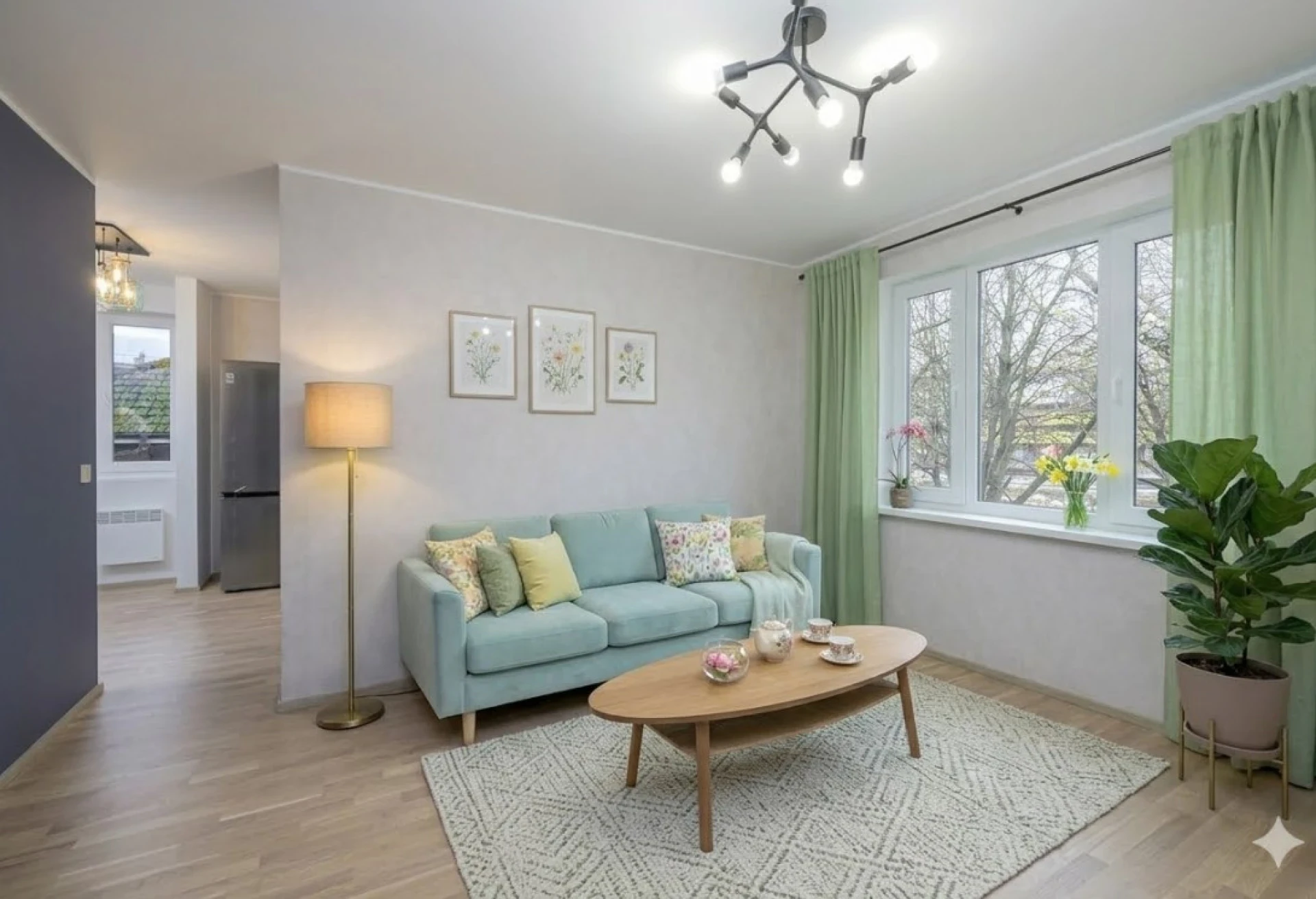 APARTMENT This meticulously renovated apartment has been transformed into a cozy home by altering the layout and using tasteful and high-quality finishing materials and lighting solutions. Every detail of the interior design, from the floor tiles to the glass in the doors, has been thoughtfully planned to create a harmonious whole. The living- and bedroom, with windows facing the sun, are accented with stylish wallpapers and lighting fixtures, adding character to the space. The kitchen is fully equipped with everything you need to prepare delicious meals, featuring brand-new appliances, including a dishwasher and a spacious fridge (Franke, Schott Ceran, LG). Thanks to the careful renovation, the shower room and WC are separate. An energy-efficient smart water heater has been installed in the shower room and underfloor heating provides the luxury feeling of stepping out of the shower onto a warm floor. The floors are covered with 3-strip oak parquet.