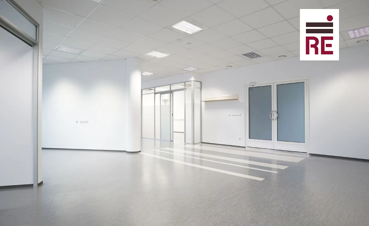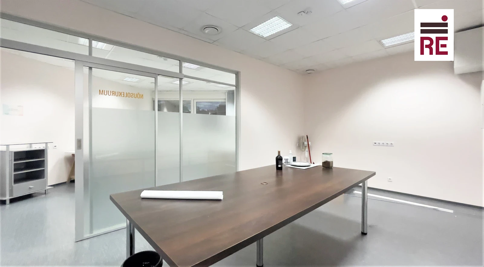 Pind jaguneb: avatud tööala; kaks akendega kabinetti; koosolekuruum.