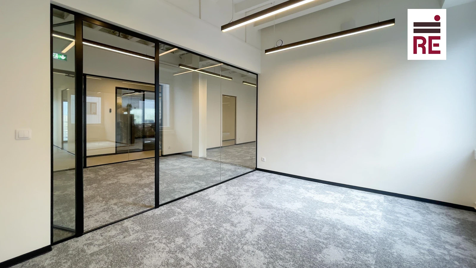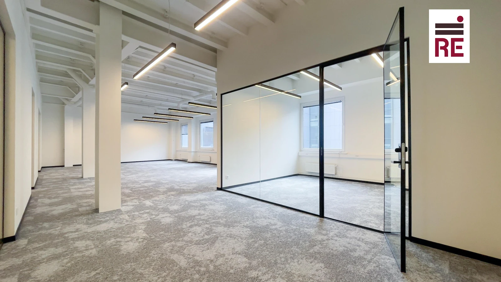 Pind jaguneb: avatud tööala, kööginurga valmidus, väike koosolekuruum ja isiklik tualett.