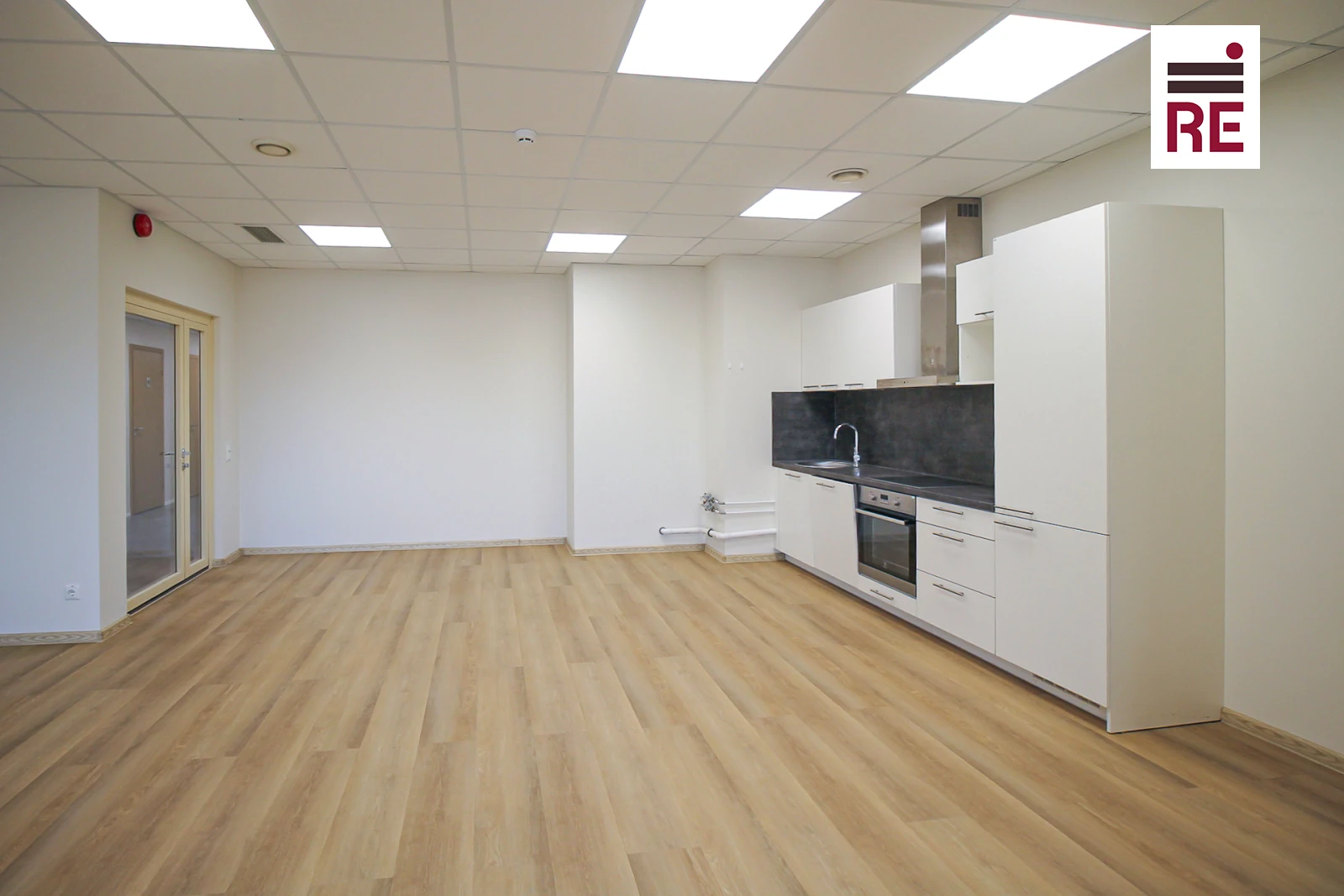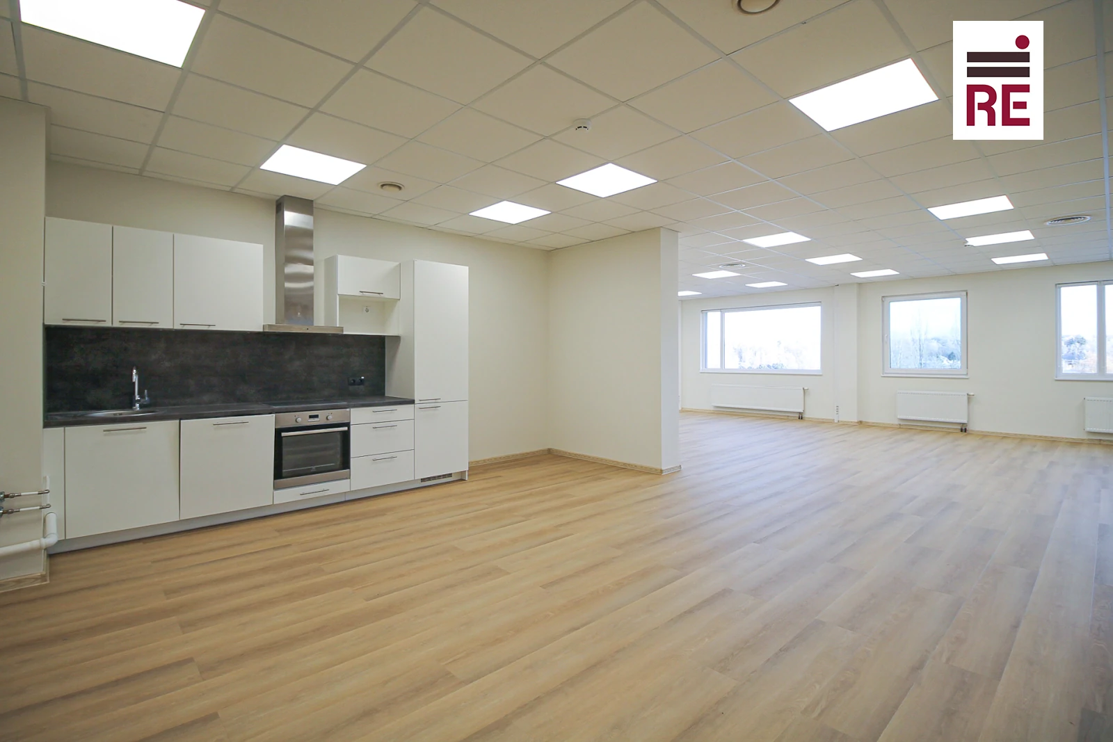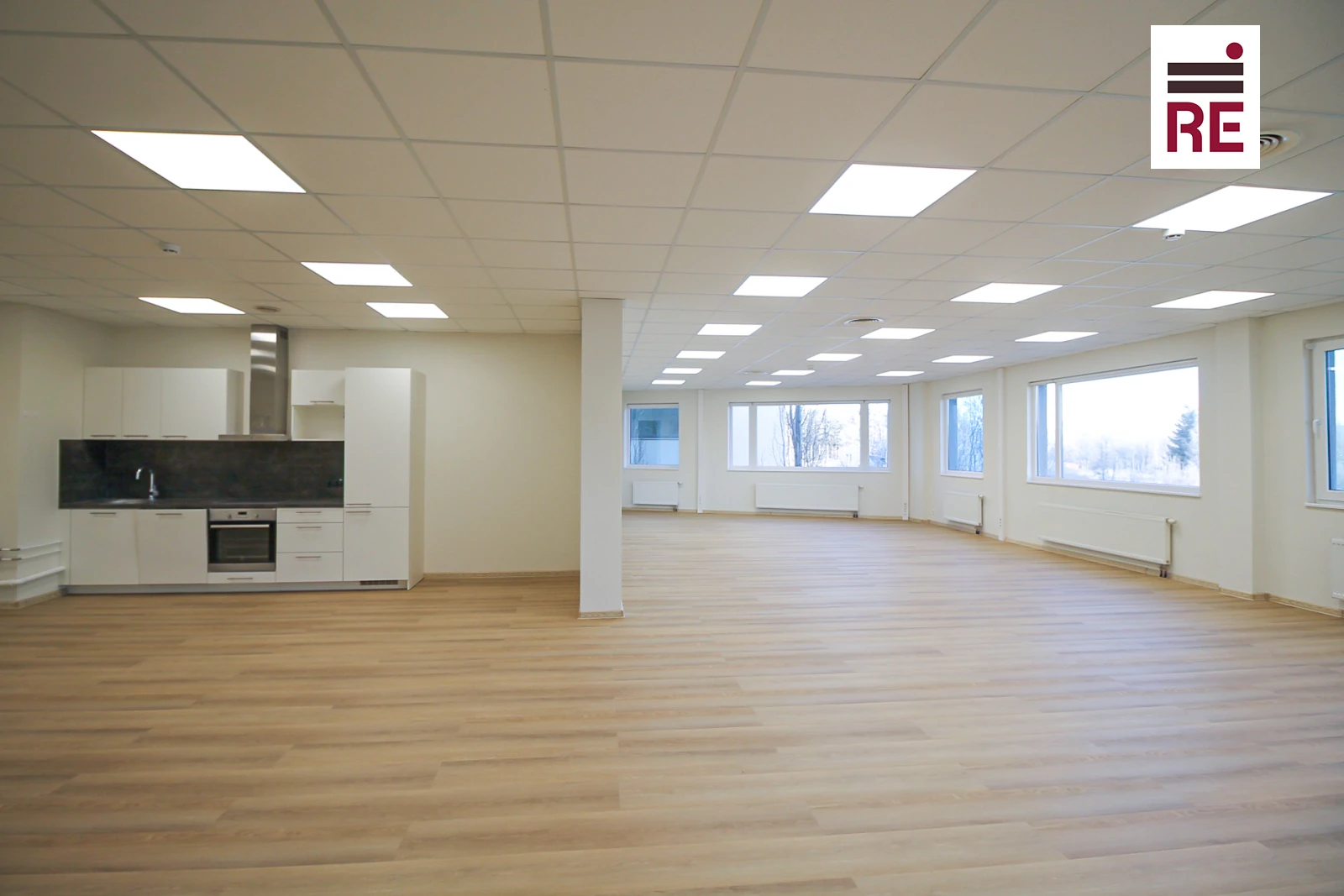 -Büroopind koosneb avatud tööalast, eraldi tööruumist ja sisustatud kööginurgast.