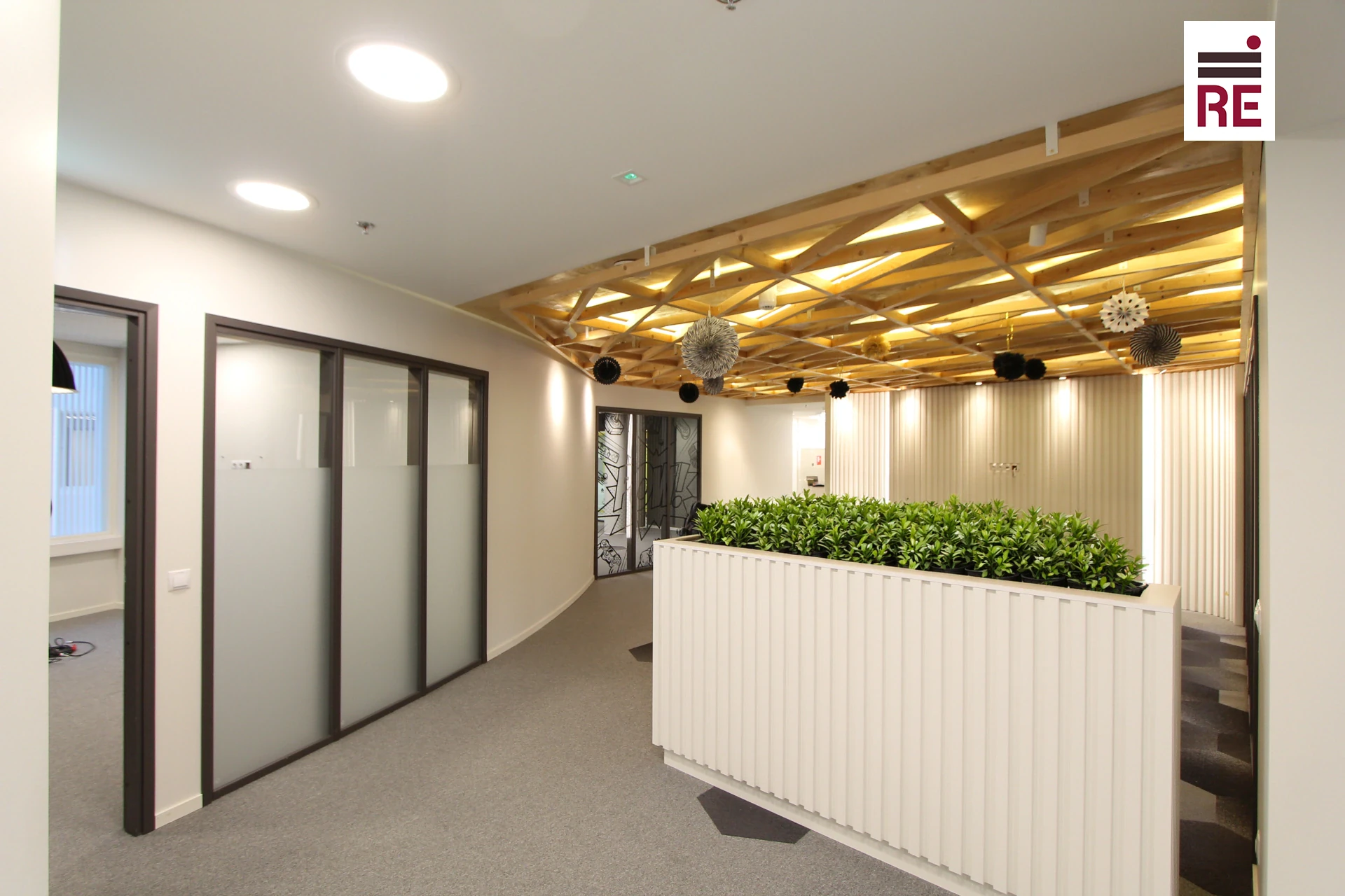 Büroos on mitu eri suurusega tööala (1-2 töökohta kuni 6-10 töökohta), mitmed nõupidamisruumid ja 4 kõneboksi. Lisaks mööbli ja tehnikaga varustatud köök (külmik, nõudepesumasin). Büroos on ka kaks tualettruumide plokki.